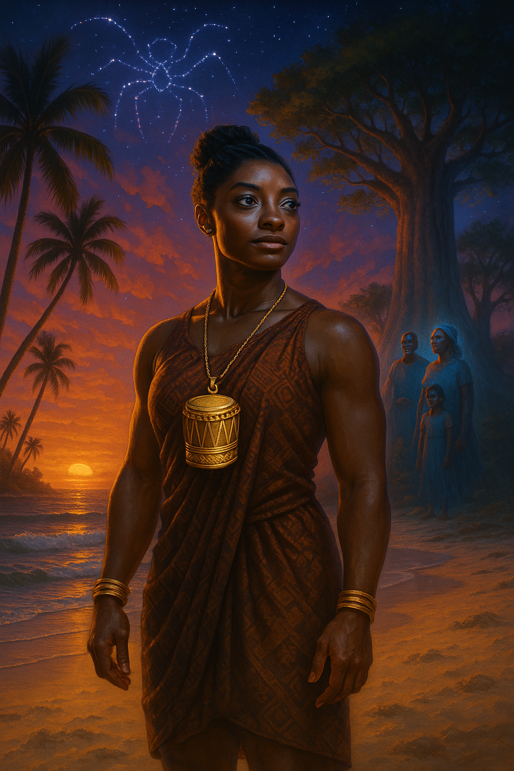 🌴 Tigemeri Nisamina, their daughter—the Light of Imagination—twirled beneath the silk cotton tree, casting charms made of gold into the seafoam, one for each diaspora dream returned home.