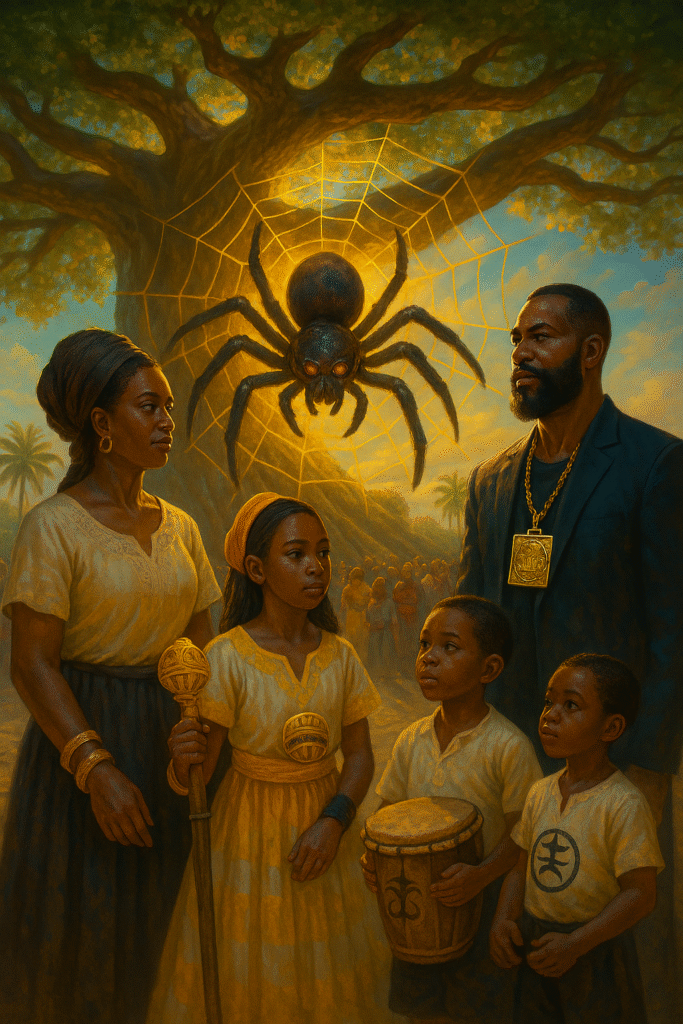From beneath the Ceiba’s roots, Anansi emerged, cloaked in threads woven of drum beats, tears, and Wi-Fi.