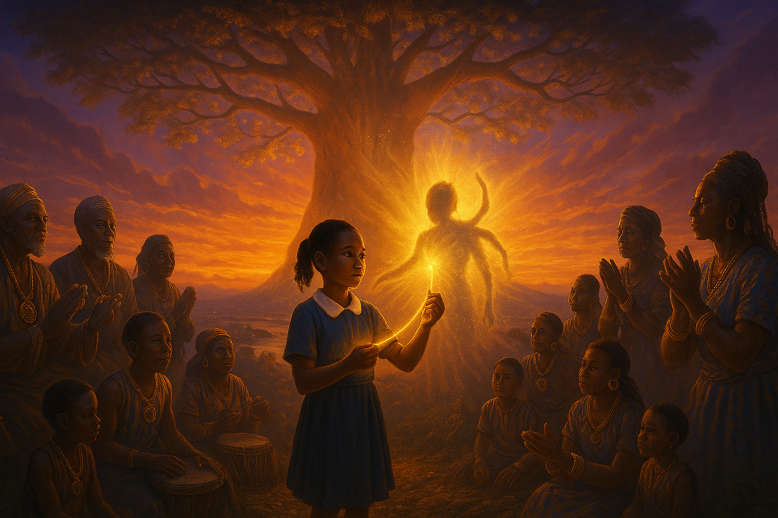 Under the watch of the Ceiba Tree, elders, teachers, griots, farmers, drummers, and children ascended the Sacred Hill where Anansi had first dreamed of balance.
